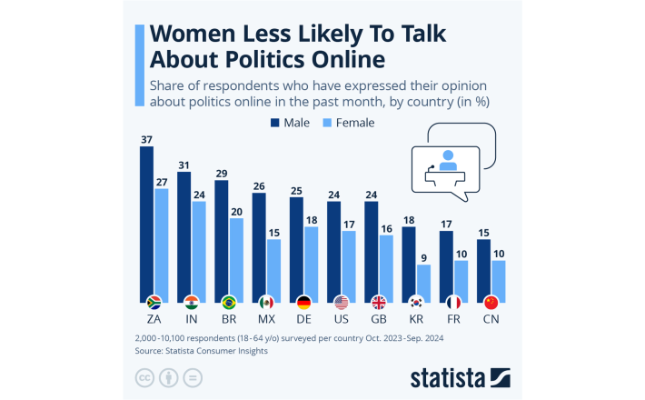 Women are more likely to be hesitant in expressing their opinions about politics online than men, a new survey by Statista Consumer Insights has found. This was the case in all of the 21 countries polled, with the gender gap narrowest in Finland at 3 percentage points (22 percent male, 19 percent female) and widest in Mexico at 10 percentage points (26 percent male, 15 percent female). This mirrors wider patterns of gender roles and equality in society, with Finland having scored in the top three places in this year’s Global Gender Gap Index by the World Economic Forum.