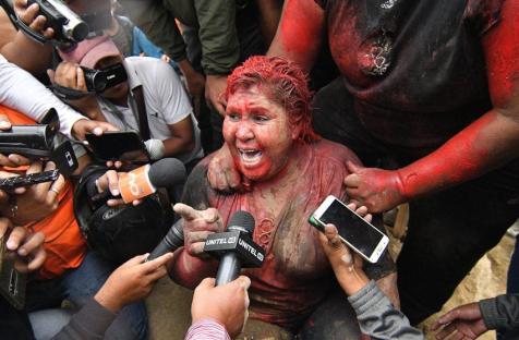 The mayor of a small town in Bolivia has been attacked by opposition protesters who dragged her through the streets barefoot, covered her in red paint and forcibly cut her hair.