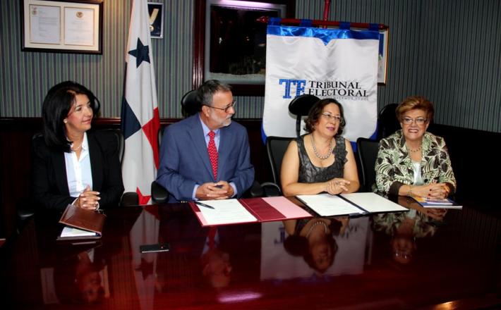 En la gráfica, momentos que registran la firma del Convenio con el Tribunal Electoral de Panamá, donde firman, Gloria Young, directora del Centro de Estudios y Competencias en Género y el Magistrado Eduardo Valdéz Escofery, flanqueados por Esmeralda Troitiño, del Grupo Iniciativa por la Paridad y por la Magistrada Suplente.