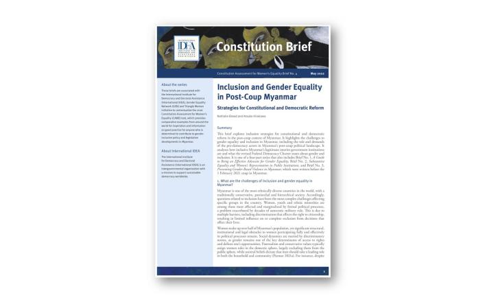 This brief explores inclusion strategies for constitutional and democratic reform in the post-coup context of Myanmar. It highlights the challenges to gender equality and inclusion in Myanmar, including the role and demands of the pro-democracy actors in Myanmar’s post-coup political landscape. It analyses how inclusive Myanmar’s legitimate interim government institutions are and what the revised Federal Democracy Charter states about gender and inclusion.