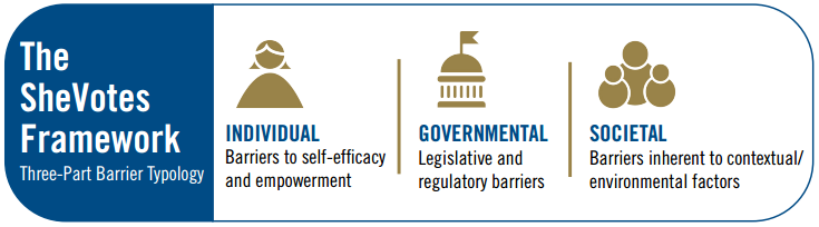 Based on its experience conducting gender assessments of elections throughout the world, as well as a review of external research and analysis of women’s participation in elections, IRI has developed a framework for this assessment based on a three-part typology of barriers. Individual barriers impede women’s self-efficacy and empowerment. Government barriers include legislative and regulatory provisions that undermine—through omission or commission—women’s participation. Societal barriers include norms of patriarchy or misogyny that exclude women from participating fully in the public sphere. These three types of barriers can exist in isolation and have discrete effects on women’s political participation. However, they are more often mutually constitutive and reinforcing. For example, electoral rules that fail to explicitly protect women’s access to political and electoral processes often indicate deeply embedded social norms of patriarchy. Therefore, the barriers to women’s political participation in any society are often multidimensional, reflecting the complex interaction of cultural values and institutional rules. Consequently, overcoming these barriers necessitates not simply encouraging women to overcome them, or even changing laws and practices, but also transforming the gender norms that undergird them.