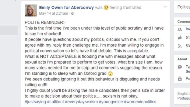 Labour's Aberconwy parliamentary candidate Emily Owen said she had been trolled by men asking her bra size and telling her to strip for votes.