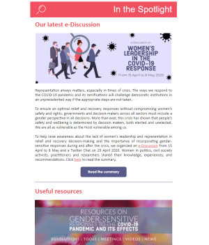 We are pleased to share with you the latest edition of the iKNOW Politics Newsletter! In this issue, we invite you to take a look at our most recent e-Discussion on women's leadership in the COVID-19 response, useful resources on gender-sensitive responses in a pandemic context, exclusive interviews with women in politics, and learn about the latest stories from around the world as you browse through our news section and online library. You will also discover our partner organizations’ recent updates and publications.